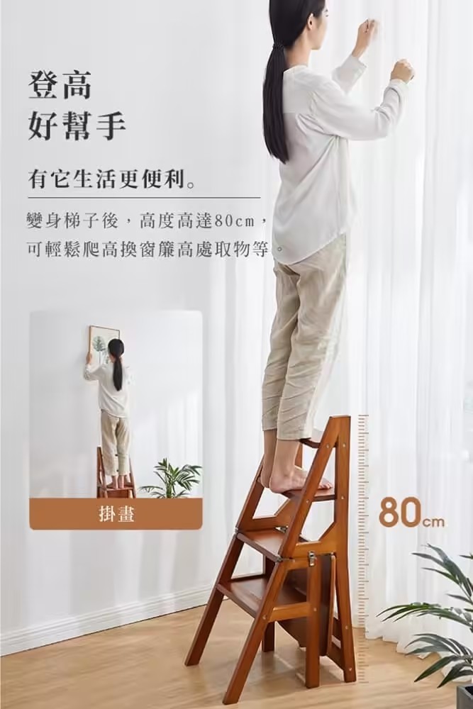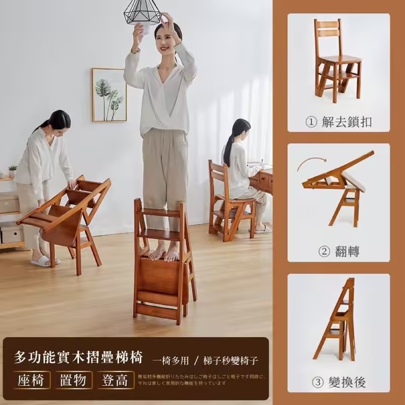 半小時前【現貨】二合一折疊梯子椅,木料製作,打磨精緻,可變為簡易小梯子,可幫助拿取高處物品 - 【四層|純實木|椅子秒變梯子】NT$2880